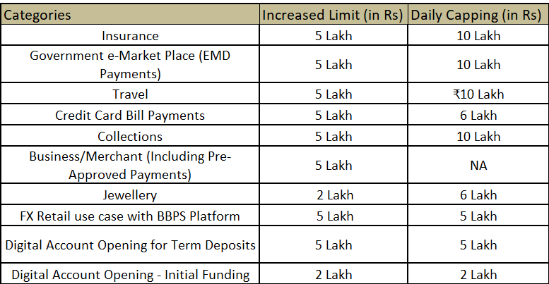 Journey bookings: The restrict for journey bookings has additionally risen from Rs 1 lakh to Rs 5 lakh per transaction, with a Rs 10 lakh every day cap.
