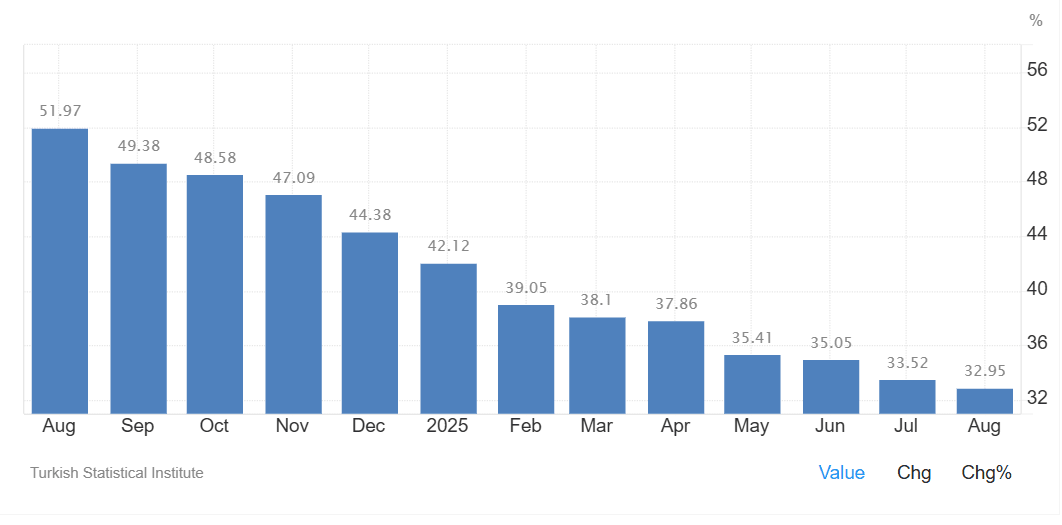 Turkey’s annual inflation fee remained excessive at 32.95% in August, barely above market expectations of 32.6% and slower than 33.52% in July.